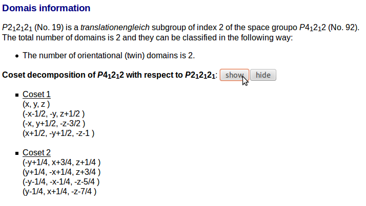 After the information about the input one can find the information about the domains which contains the cosets decomposition between the high and low space groups: