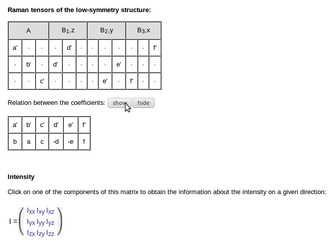 Using each one of the cosets representatives it is transform the raman tensor and the is a direct link to the intensity expressions. In this case there are two twin domains, one of the cosets representatives is the identity so the Raman tensor remains the same. The other coset representative is b,-a,c, using this cosets as transformation matrix the tensor transforms as: